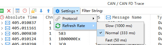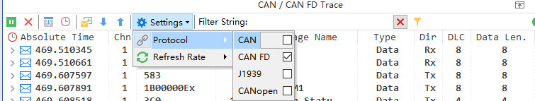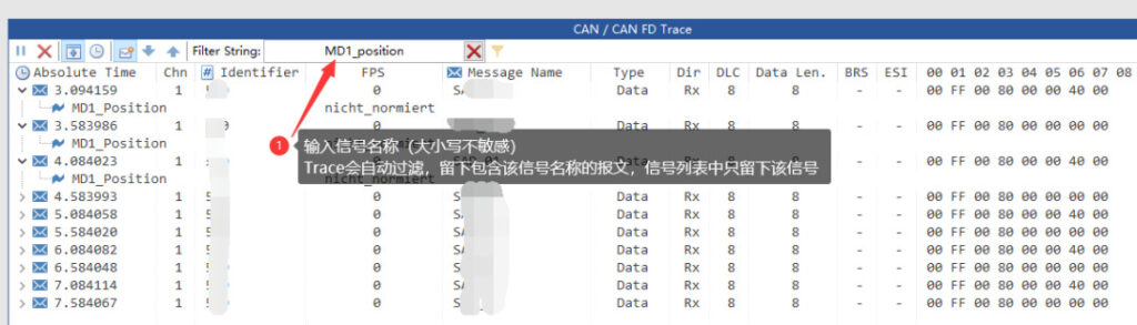 You can directly enter an ID value in the filter string, and the Trace window will leave only the messages corresponding to that ID; or enter a signal name, and the Trace window will leave only the messages associated with that signal. The details are as follows: