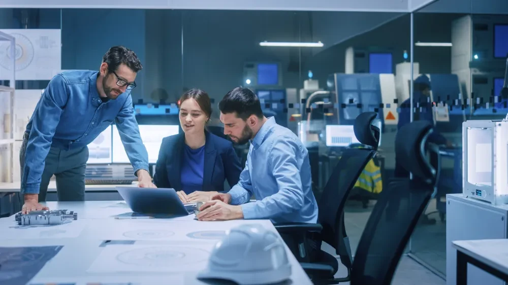 A group of three professionals working together on a laptop in an office environment.