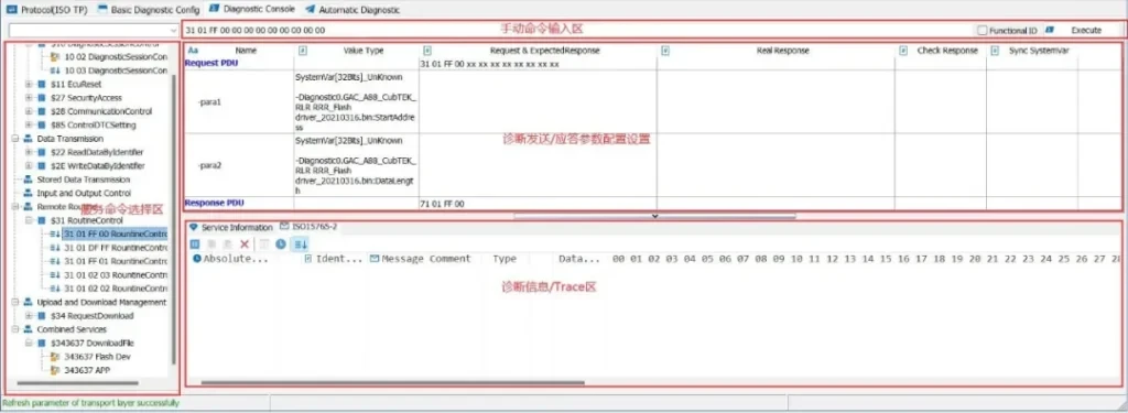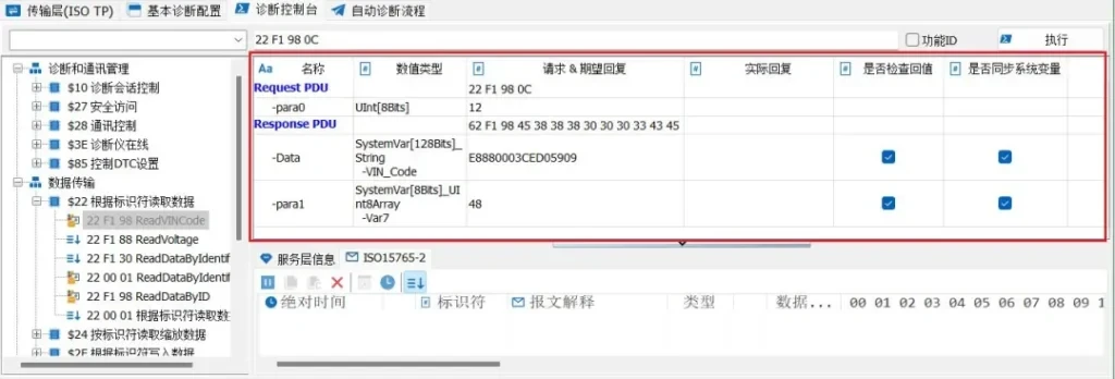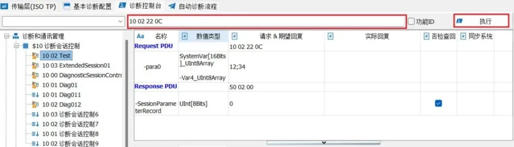 In this area, the user can edit the Send Data Segment as well as the Expected Received Data Segment to initiate execution to verify that the diagnostic response of the ECU under test meets the actual requirements and synchronizes the diagnostic system variables, as shown in Figure 4-4.