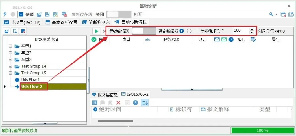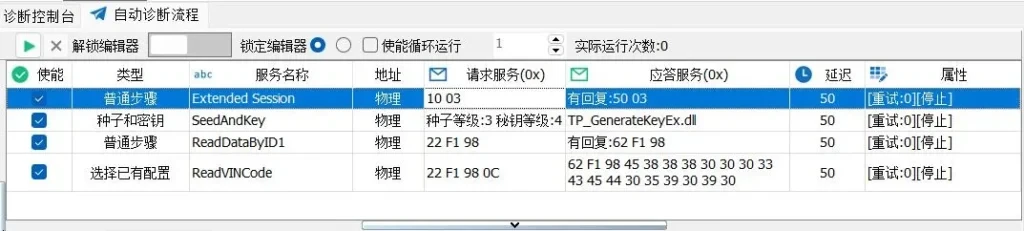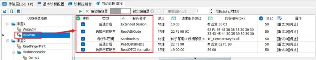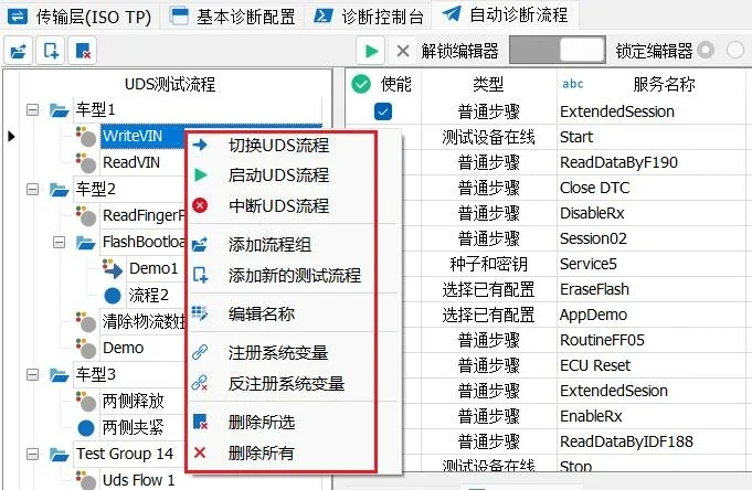 [2] Start UDS Process: Starts the diagnostic process for this node. After clicking this option, the diagnostic module automatically executes the diagnostic steps from top to bottom according to the configuration on the right.