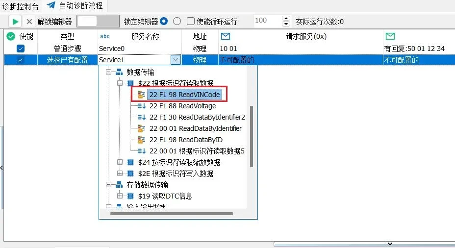The Service Command Selection Area is a list of executable services generated based on the base configuration or loading the ODX/PDX diagnostic database. You can double-click to execute the selected service or right-click to select to execute the service, as shown in Figure 4-2.