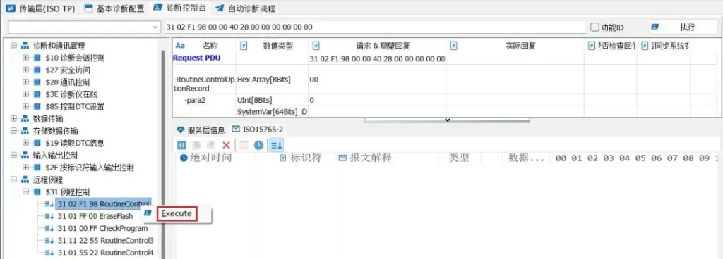 During the test, if you want to send any diagnostic command, you can enter any message you want to send in the manual command input area. After entering the diagnostic message, click the Execute button on the right to finish sending the diagnostic message. In order to increase the flexibility of the test, you can also select whether to send the diagnostic request message by physical address or by function ID through the selection box. As shown in Figure 4-3.