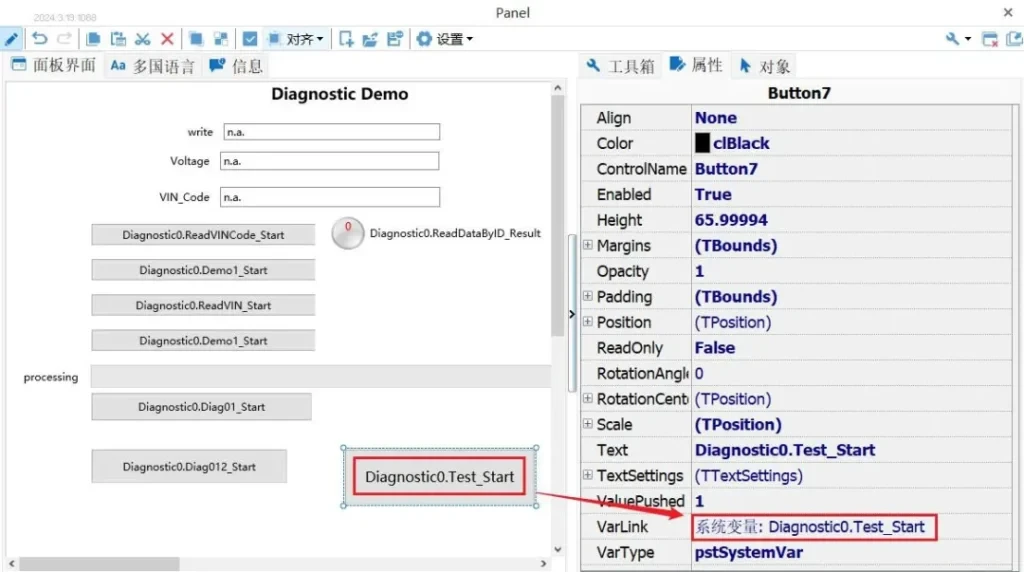 [3] Add the button button control in the Panel Panel and associate the generated system variable process name _Start, and set the button press event to 1, as shown in Figure 5-20.
