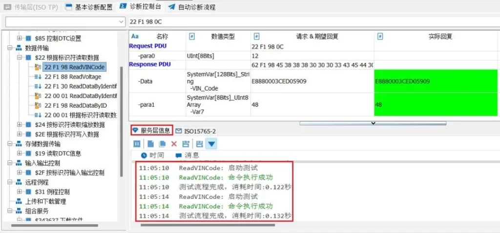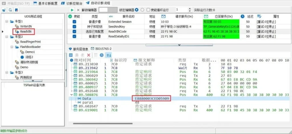 The response is executed, and the VIN code of the ECU is read normally, meanwhile, the step of selecting the existing configuration can read the VIN code "E8880003CED05909" directly because of the corresponding parsing information. As in Figure 6-2.