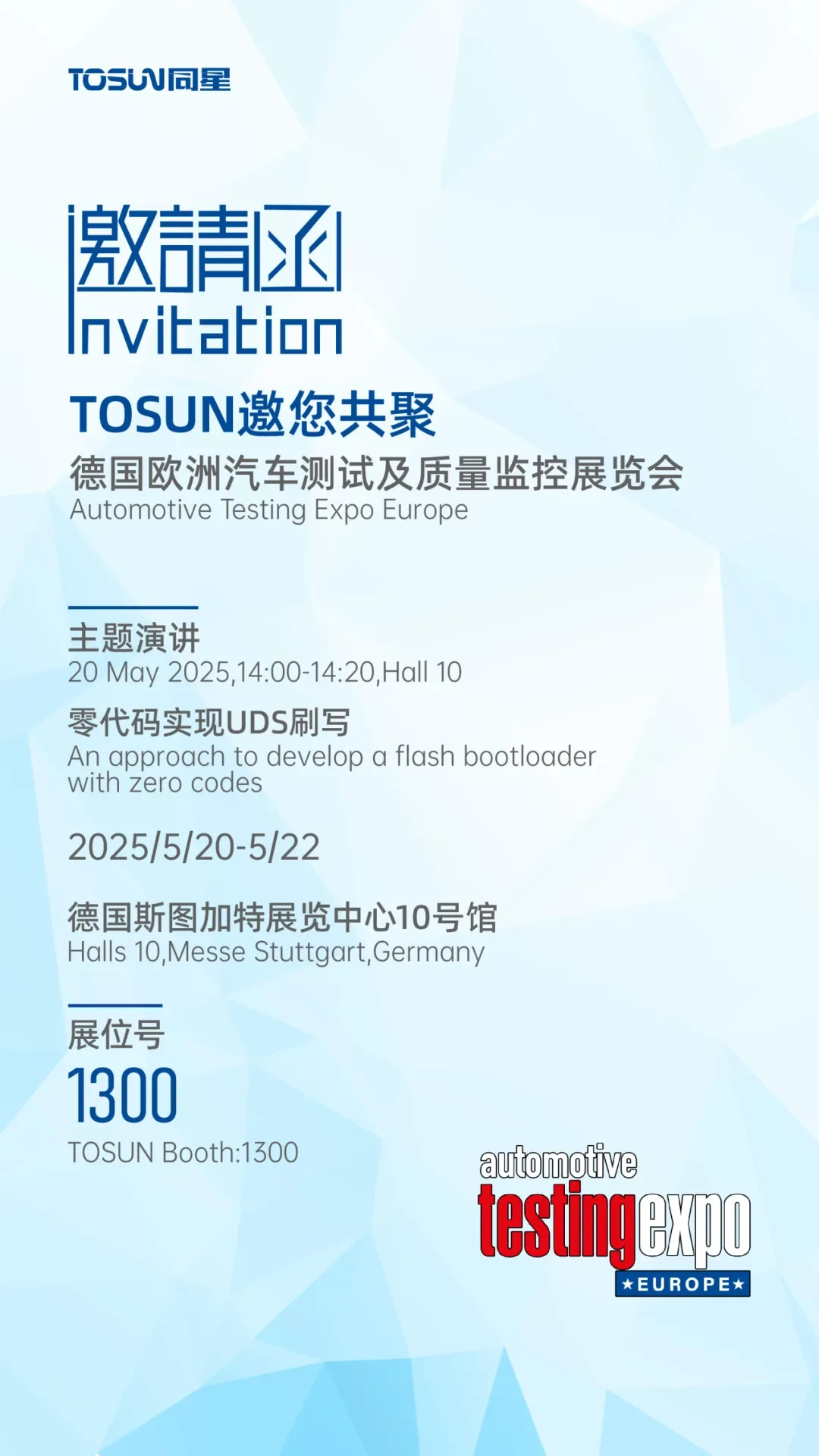 Automotive Testing Expo Europe 2025 will be held from May 20 to 22, 2025 at Messe Stuttgart, Germany. As a leading company in the basic tool chain of automotive electronics, TOSUN will bring its innovative solutions to the exhibition in Hall 10, Booth 1300, and bring the technical speech of “Zero Code Realization of UDS Flashing”, presenting the industry with a new paradigm of smarter and more efficient automotive electronics development.