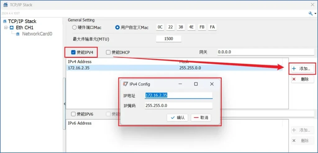 The tester IP is the IP address of the test device (e.g., TOSUN's TE051) connected to the PC. According to the IP address mask and the IP address of the device under test, configure the IP address of the PC and the IP address of the device under test in the same network segment, so that they can connect and communicate normally. The configuration of the IP address of the tester has been described in detail in the previous Chapter 3.