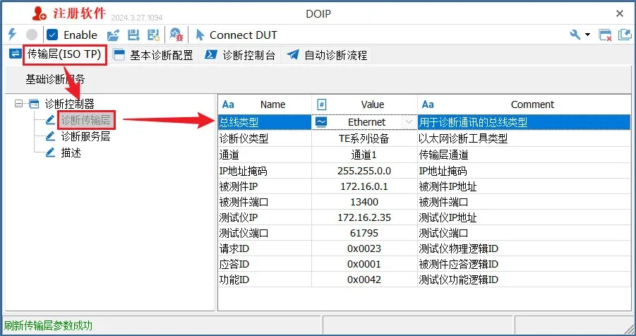 For the DoIP Diagnostics Transport Layer ISO TP, the Ethernet parameters and Diagnostics ID parameters for the DUT and tester are included, as shown in Figure 4-1.
