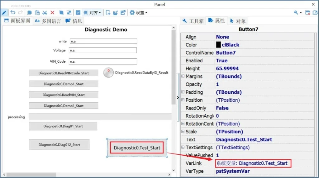 [3] Add the button button control in the panel Panel, and associated with the generated system variable process name _Start, will set the button press event to 1, as in Figure 7-20.