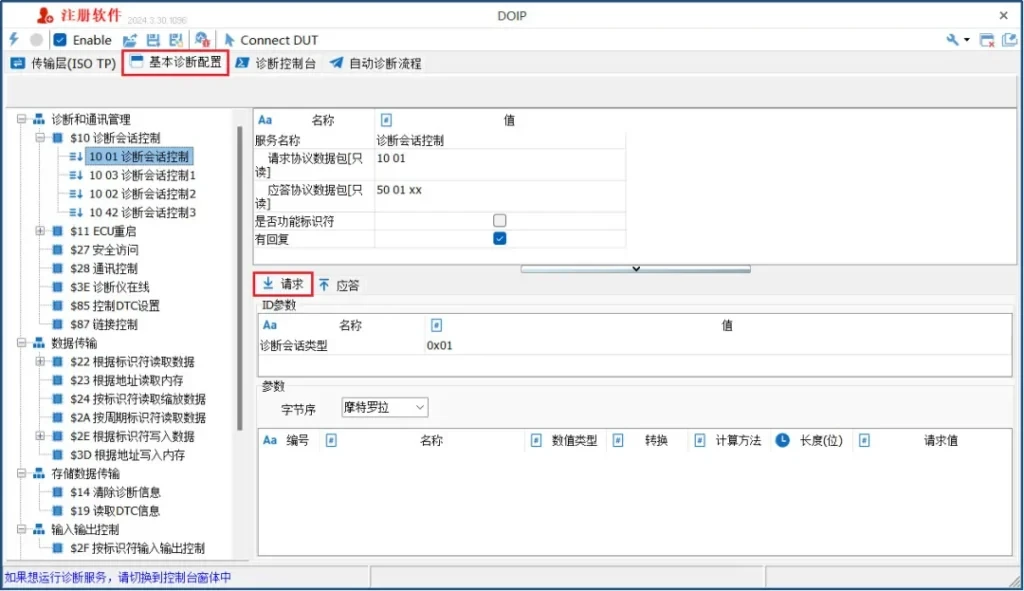 ▲ Step4: When configure the transport layer related parameters and security algorithm, start the project, click [Connect DUT] to connect the vehicle controller. When the connection is successful, the Basic Diagnostics window and the System Message window will prompt: Connect Ethernet DUT successfully, as in Figure 2-3. as well as in the place of ISO15765-2 you can see the service message of the connection, as in Figure 2-4.
