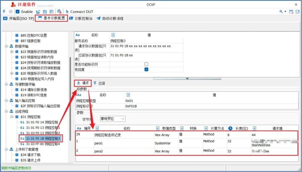 The DoIP diagnostic transport layer, ISO TP, contains the Ethernet parameters and diagnostic ID parameters for the DUT and tester, as shown in Figure 4-5.