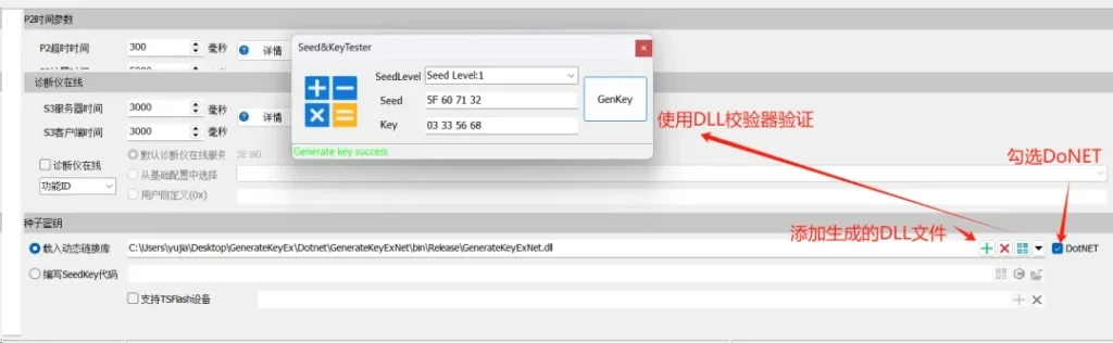 During the UDS diagnostic process, it involves the issue of security access, which is also called Seed&Key. TSMaster Diagnostic Module supports loading the Seed&Key algorithm for security access unlocking through a .dll file. In the recently released version 2024.03 of TSMaster, it not only supports DLL files encapsulated in C/C++, Delphi and other languages, but also supports DLLs based on DotNet platforms, such as C#, VB.Net and other languages, which is efficiently compatible with security access dlls generated by different platforms, and brings engineers a more convenient use experience.