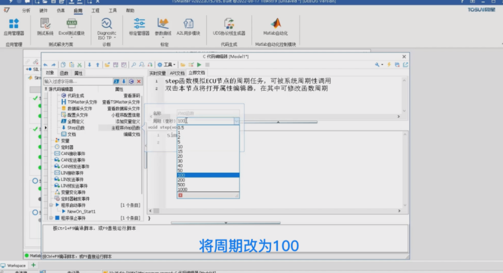 > We go back to our applet and click on global definition #include, "simple.h". Then the next is COPY. we double-click this simple initialization, and then to the initialization event of the applet, paste and then COPY STEP to our applet's STEP function, paste and then TERMINATE, back to our applet's STOP event, the same paste, so as to achieve the function call. Then we need to pay attention to the period of the step function, the default period is 5 milliseconds, but the model is certainly not. Let's start by opening up this simple.slx, and then we'll go to the properties of the model and look at the properties of the solver associated with the model. It's a fixed step size, and the step size is 0.1 seconds, so 0.1 seconds is 100 milliseconds in TSMaster, double-click on the STEP function, change the period to 100, and then the next thing we need to do is to observe the signal out1.