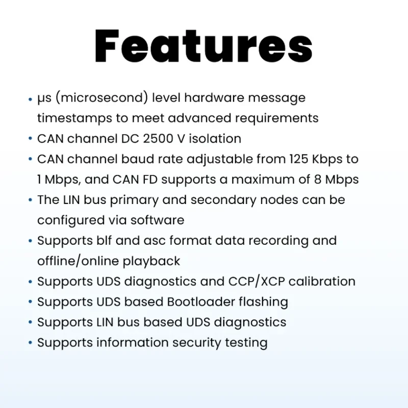 - Automotive grade design, support LDF, dbc file, a2l file, blf file, asc file, arxml file.