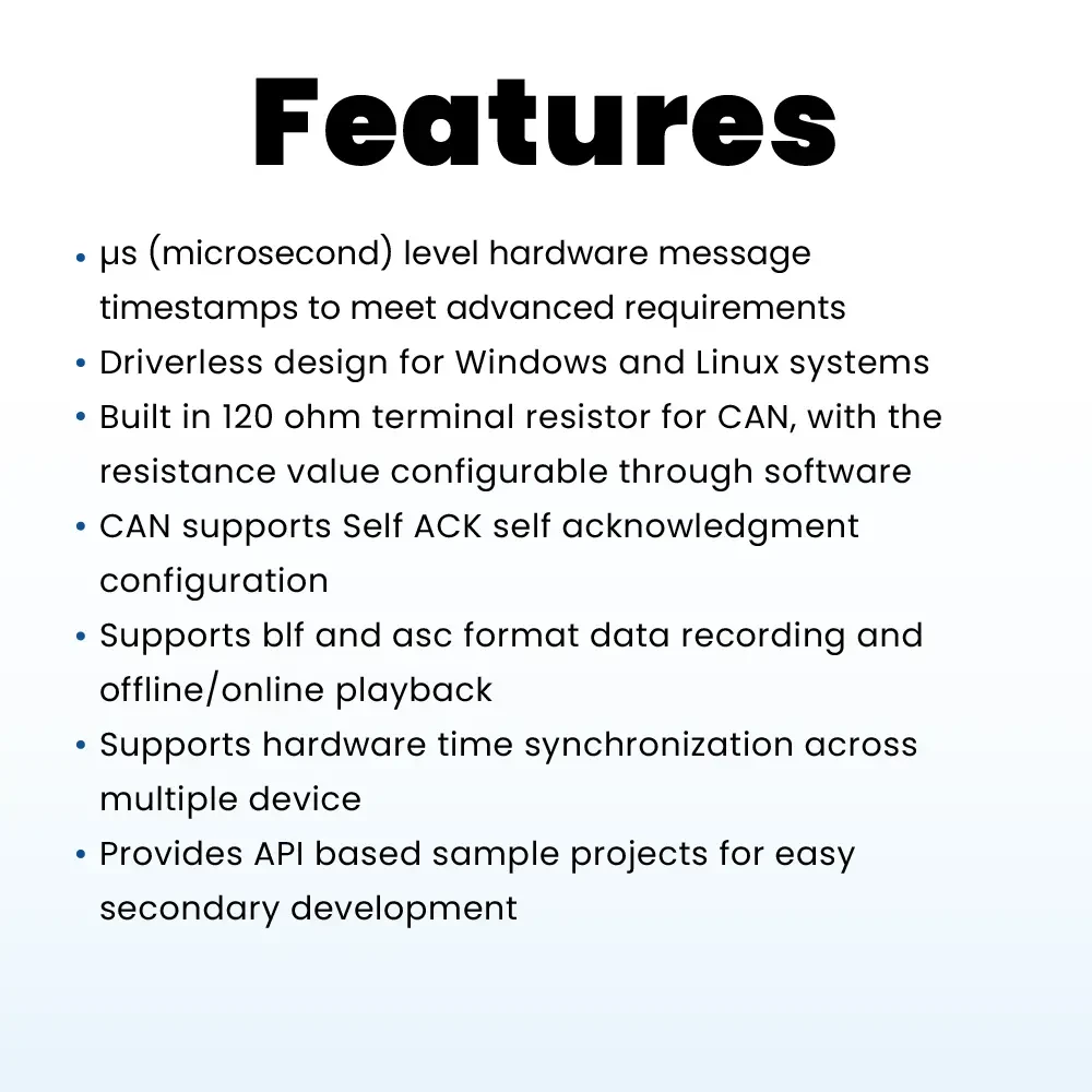 - CAN channel baud rate 125Kbps-1Mbps adjustable, CAN FD support up to 8Mbps; CAN built-in 120Ω termination resistor can be configured by software