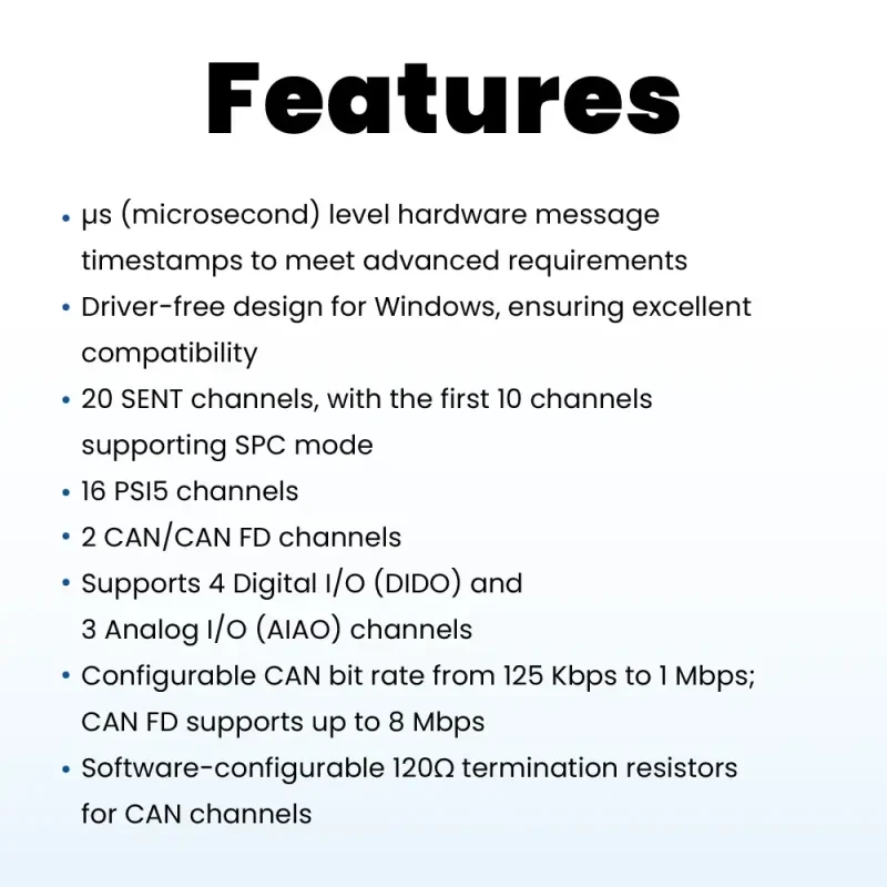 - Compatibility with SENT and PSI5 interfaces, capable of receiving data from various types of SENT and PSI5 sensors