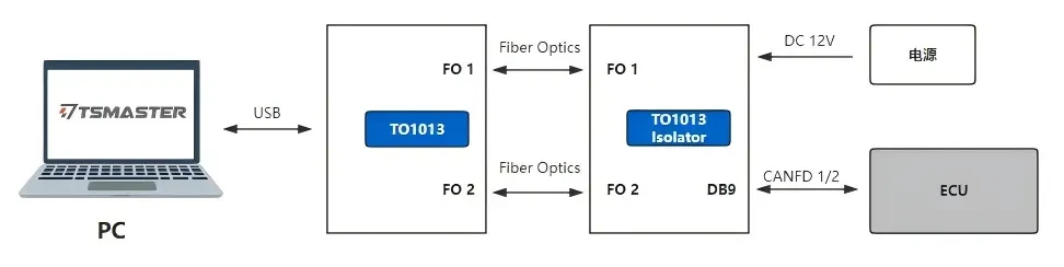 The TO1013 Isolator end is placed directly in the darkroom to convert CAN bus data into fiber optic transmission; the TO1013 end transfers CAN data from fiber optic transmission directly to the computer via USB, and with the powerful TSMaster software, which supports loading of DBC and ARXML database files, it can be very easy to monitor, analyze, and simulate the CAN FD/CAN CAN FD/CAN bus data can be easily monitored, analyzed and simulated.