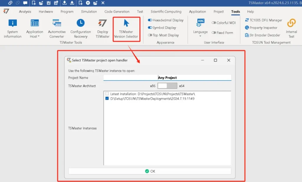 02. Added: TSMaster version selector to control the default project opening behavior.