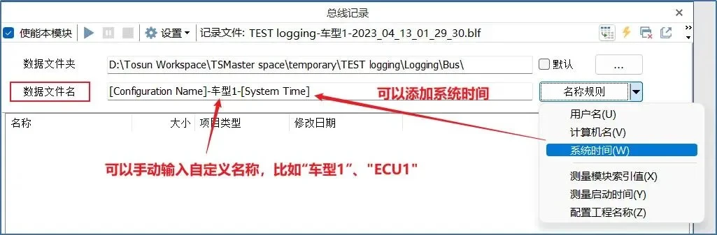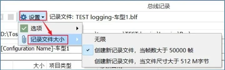 Depending on the test occasion, you can configure the generation of different logging file sizes. TSMaster supports unlimited, per message frame and file size saving.