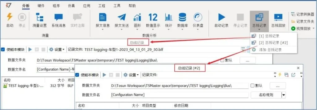 First create two bus logging modules, "Bus Logging" and "Bus Logging [ #2]", and name each logging file name. As in Figure 9.