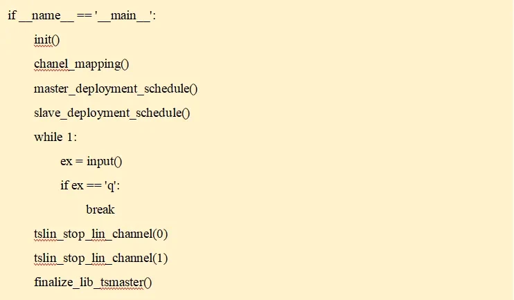 Take the TC1016 as an example, use LIN channel 1 of the TC1016 to emulate the master node, and then use LIN channel 2 to emulate the slave node. In order to realize the simulation effect, channel 1 and channel 2 can be shorted, that is, the LIN DB9 pin 6 and pin 8 of TC1016 can be shorted. The message sent from channel 1 after shorting can be received from channel 2. On this basis, the customized LIN scheduling table is realized through python secondary development interface, and the sample code is as follows: