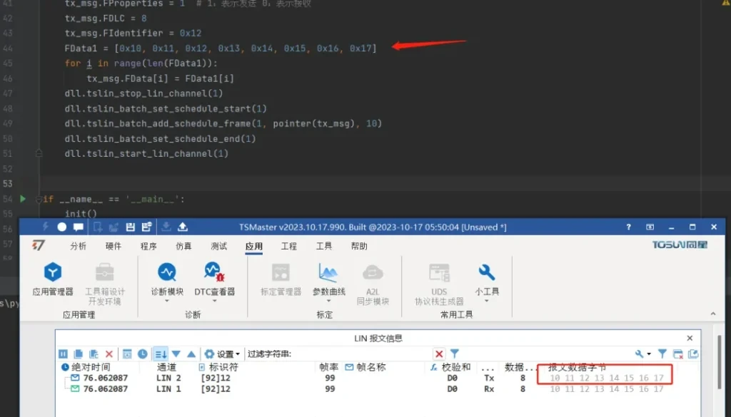 Run the python script and then connect to TSMaster to view the LIN message window: