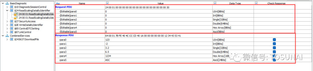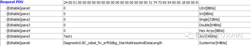 Para6, the data type is a system variable. The data length is 64bits according to the value of the extracted system variable, and the name of the system variable is Diagnostic0.BC_cebal_fw_srf05dbg_StartAddressAndDataLength, and the system automatically extracts the actual value of the system variable according to this name and parses it into the sending message during execution.