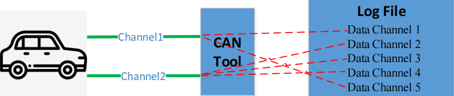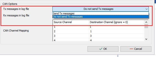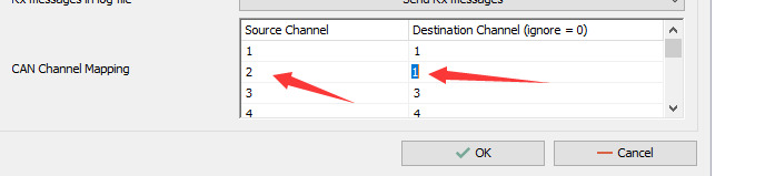 The configuration shown above means that data on channels 1 and 2 in the log file is played back on channel 1 of the CAN tool, and data on channel 3 is played back on channel 2 of the CAN tool.