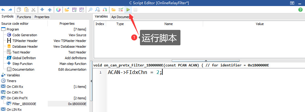 According to the previous introduction, the automatic playback of messages provides a mechanism for selecting the channel, selecting the playback RX, TX, etc. However, users often need to selectively play back some of the messages or selectively block some of the messages. However, users often need to selectively playback part of the message, or selectively block part of the message. Because the number of playback messages may be very large, therefore, the ID-based playback filtering is not included in the online playback module at present. However, through TSMaster's C Script tool, users can also block the online playback of messages based on ID.