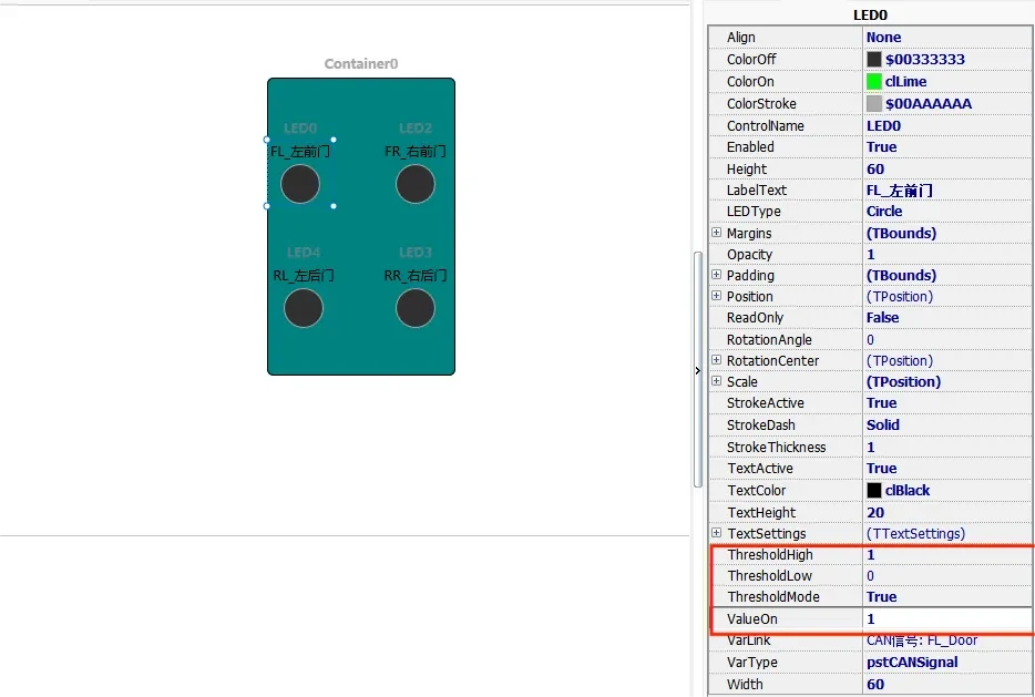 The properties of the indicator control can be in non-threshold mode (ThresholdMode=false, when the signal value is equal to the value set by ValueOn, the indicator is in point quantity state, when ValueOn is other value, the indicator is off) or in threshold mode (Threshold is a limiting value, when a certain variable reaches the value, the behavior of the control will be changed in some way, set the value of ThresholdMode to True. The value of ThresholdMode is set to True, set the high limit value of the threshold to 1 and the low limit value to 0. When the signal value is equal to or less than 0, the indicator light is off, and when the signal value is equal to or greater than 1, the indicator light is on.) As Figure 5.