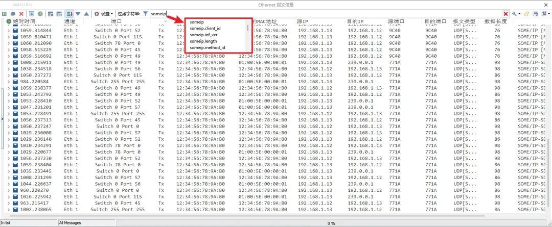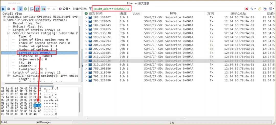 For example, in the figure below, ip4.dst_addr==192.168.1.13 means filtering messages with destination ip 192.168.1.13. Similarly, in Detail View2 on the left side, you can see the detailed parsing of someip messages, such as the service id.