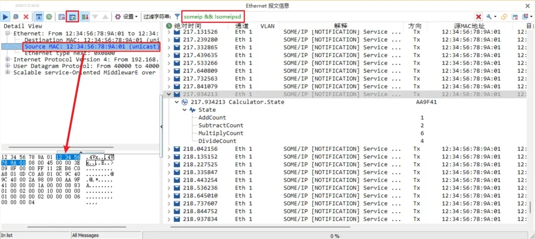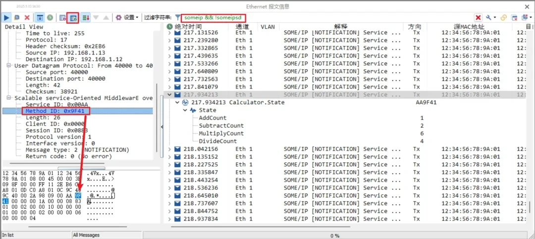 For example, someip && !someipsd in the following figure indicates someip protocol, but not someipsd protocol messages. In Detail View2 on the left side, you can view the detailed information of Ethernet messages, such as source MAC address, destination MAC address and Method id in the following figure. At the same time, TSMaster supports double clicking the corresponding parameter in the upper parameter detail window, and then automatically highlighting the corresponding selected parameter in the lower raw message window, just like wireshark, which enhances the readability of the raw message.