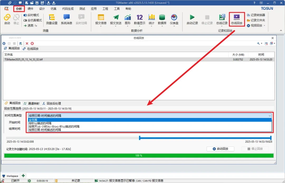 TSMaster Offline Playback supports 4 time range types: full time range, intervals described by seconds, intervals described by days-hours-minutes-seconds, and intervals described by date-time. The blue time progress bar below the type selection is synchronized in real time with the configuration above.Users can customize the playback of messages with different time ranges..