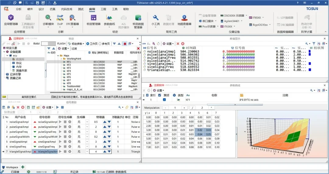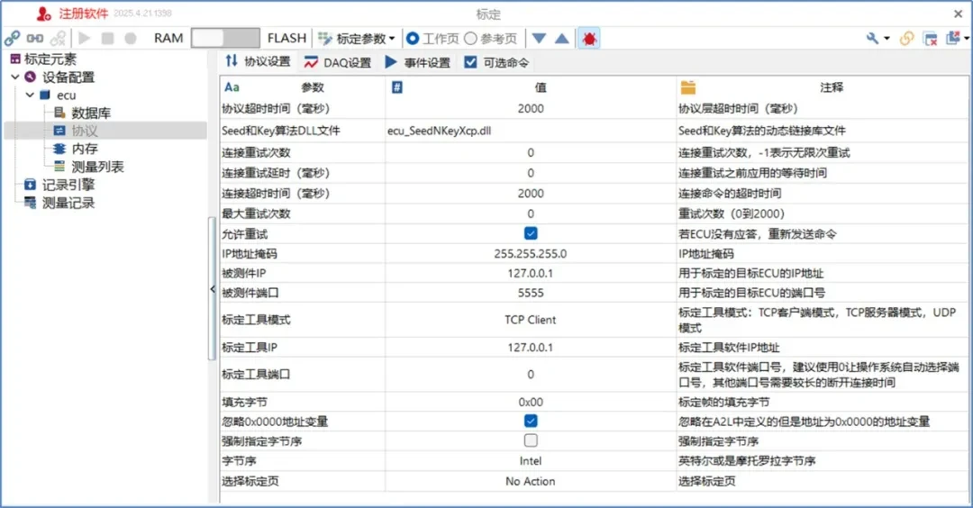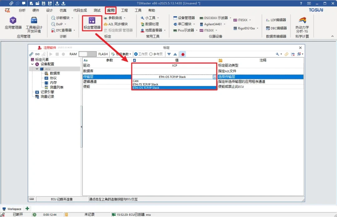 The XCP on Ethernet function is provided in the calibration module of TSMaster. Transport layer bus protocol support: [ETH::TS TCP/IP Stack], [ETH::OS TCP/IP Stack], respectively, through the TSMaster with the same star of the Ethernet device connection, and with the computer's network port directly connected to the network, can beRealization of XCP on Ethernet acquisition and calibration processing..