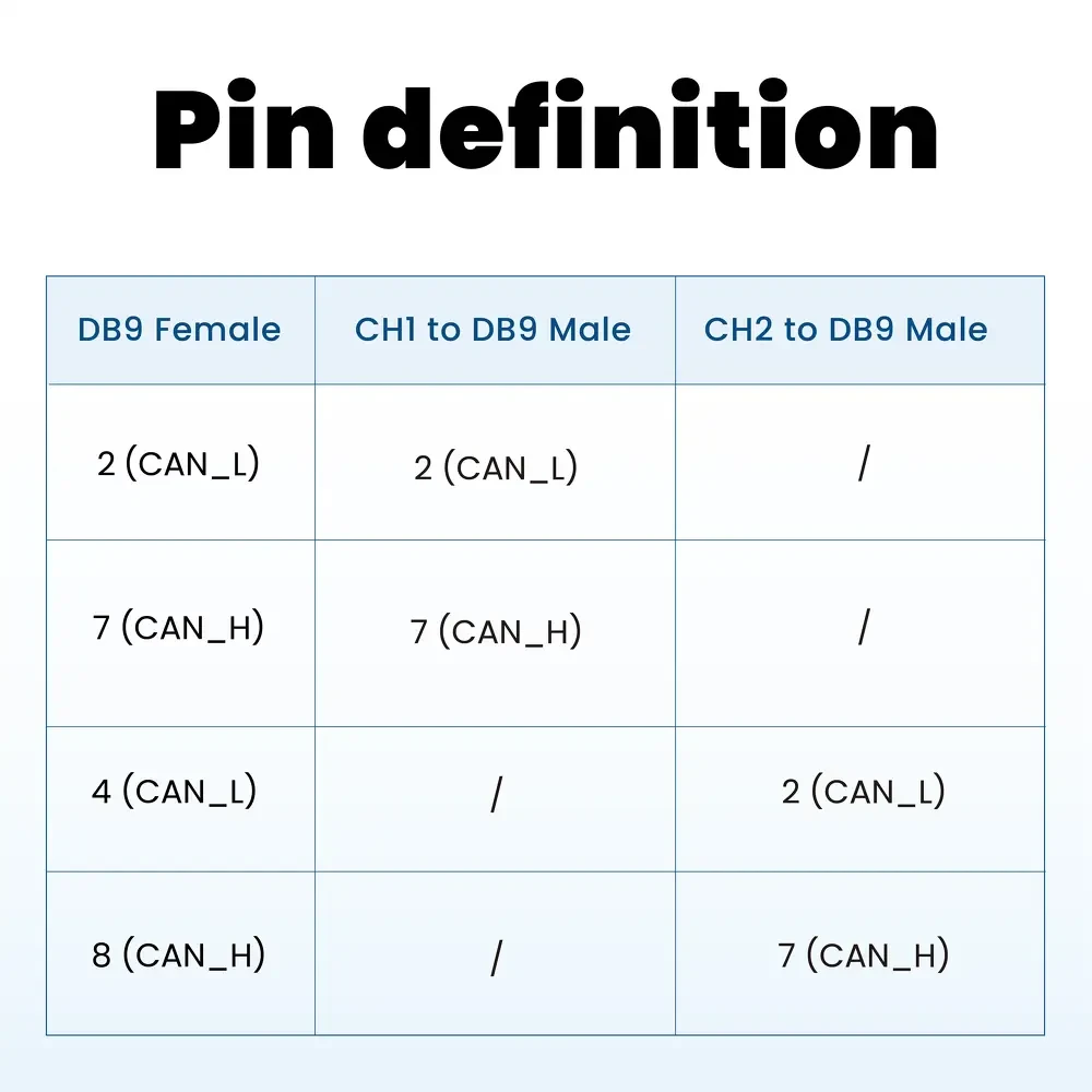 针对 TC1013、TC1014、TC1016P 等型号,将原单个 DB9 接口的 CAN FD 信号重新分配,其中 2 和 7 为 CAN_L 和 CAN_H,4 和 8 为另一组 CAN_L 和 CAN_H。分配后,引脚统一为两个独立的 DB9 接口,均采用 2 为 CAN_L,7 为 CAN_H,方便与被测件连接。