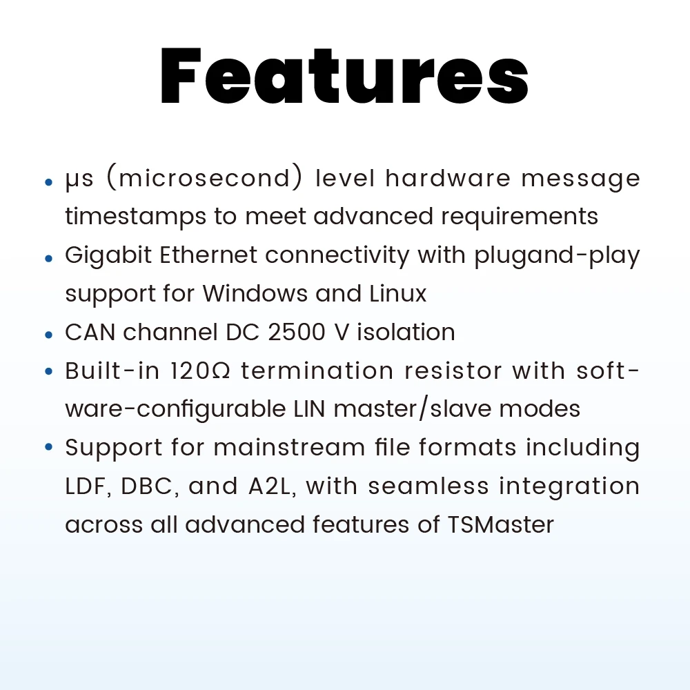 - 全面支持LDF、DBC、A2L 等主流文件格式,无缝对接TSMaster 所有收费功能