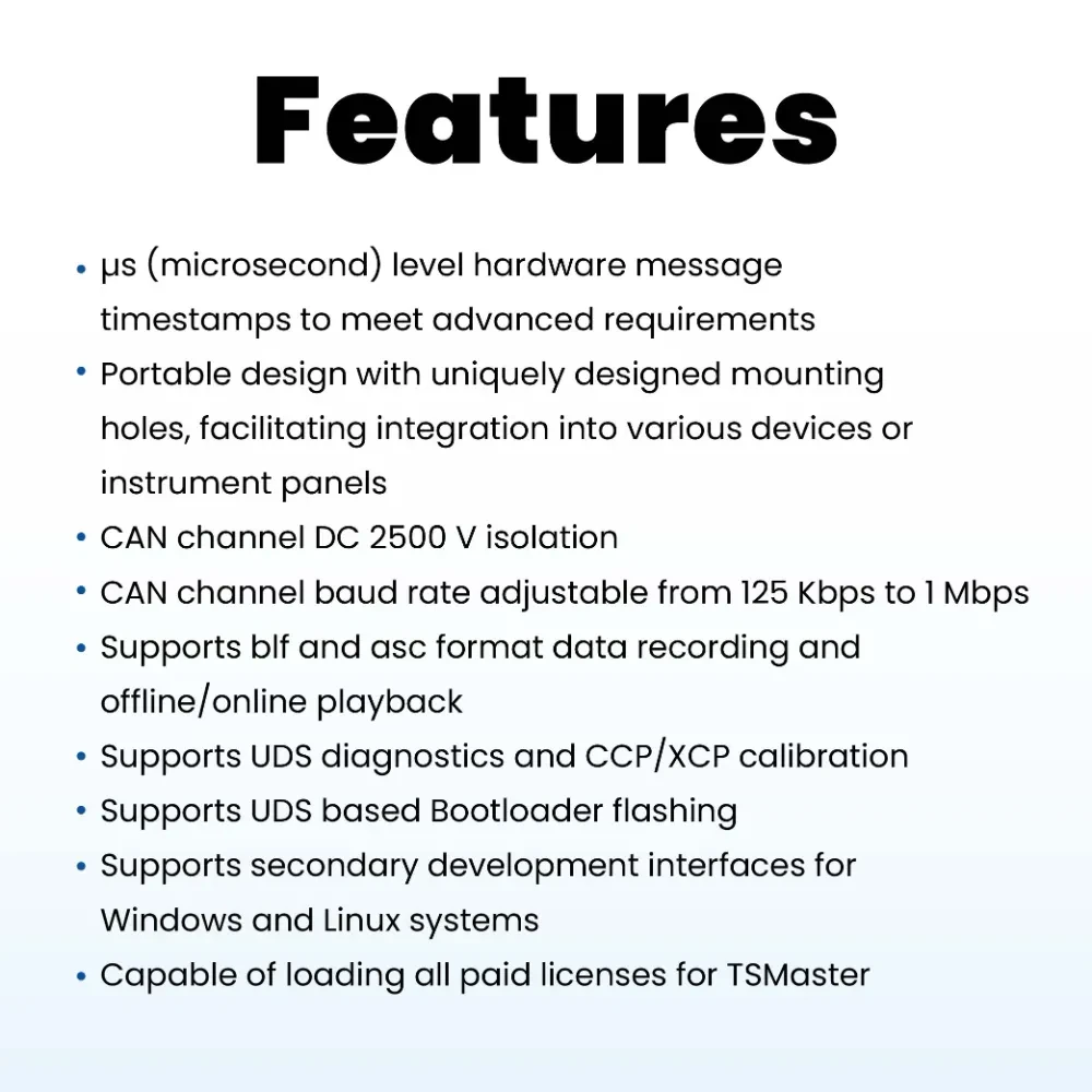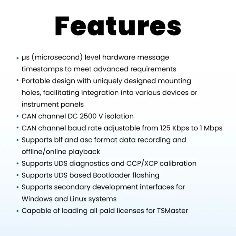 • 汽车级设计,支持dbc文件、a2l文件、blf文件、asc文件、arxml文件。