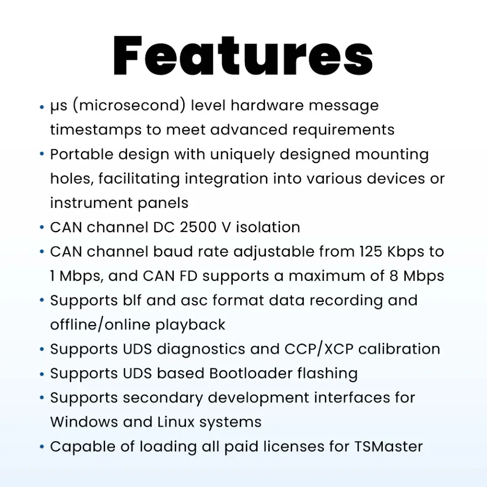- 汽车级设计,支持dbc文件、a2l文件、blf文件、asc文件、arxml文件。