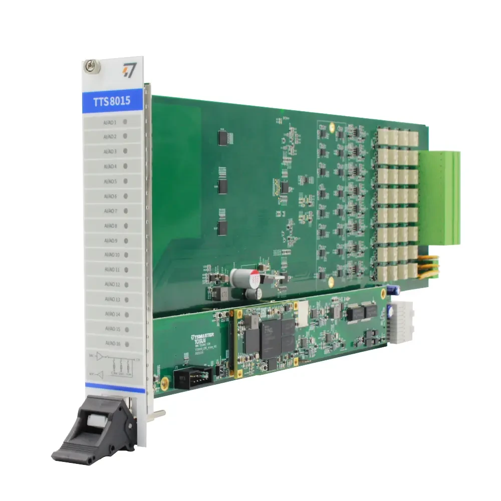 TTS8015 是一款专为 TTS 系统设计的高度集成的模拟信号处理模块,16 通道模拟输入测量,有效测量范围 0V~60V,16 通道独立模拟输出,有效输出并回采范围 0V~40V。提供高-低侧短路、对地/虚拟地/公共端短路等多种故障注入模式。板卡支持通过 EtherCAT 总线实现远程实时控制,通过 XML 文件定义的功能控制信号,可灵活配置电压输出/采集工作状态,在单个紧凑单元中集成了多通道高精度测量与可编程模拟信号输出能力,提供一体化的测试解决方案。