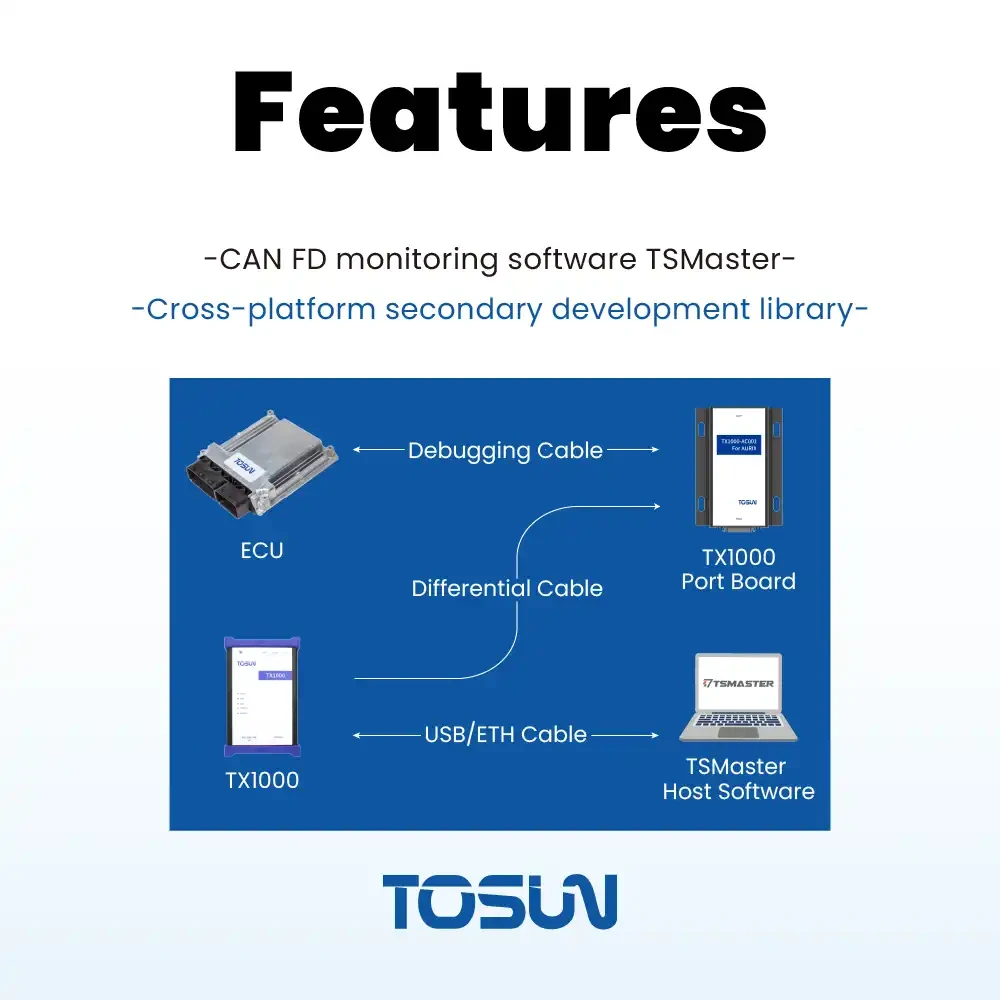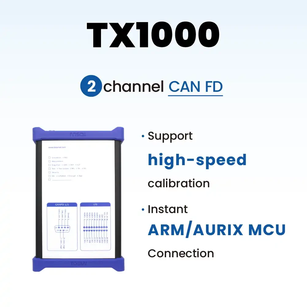 配合功能强大的 TSMaster 软件,TX1000支持连接ARM/AURIX 系列芯片;支持的调试协议为DAP(JTAG/SWD 暂未适配,后续增加);支持修改ECU 的PC 指针跳转,程序暂停,恢复等;支持连接ARM/AURIX 系列芯片,能够通过调试接口对ECU 进行高速内存访问操作,不影响ECU 代码运行。此外,TX1000 还可用于XCP 协议标定ECU。