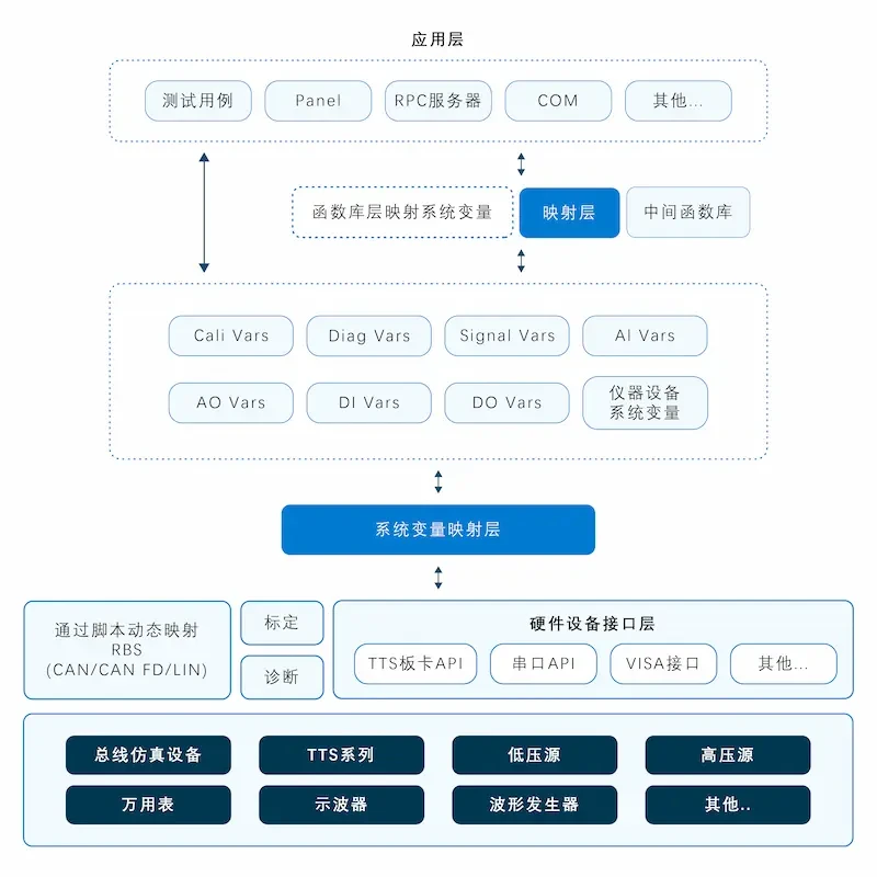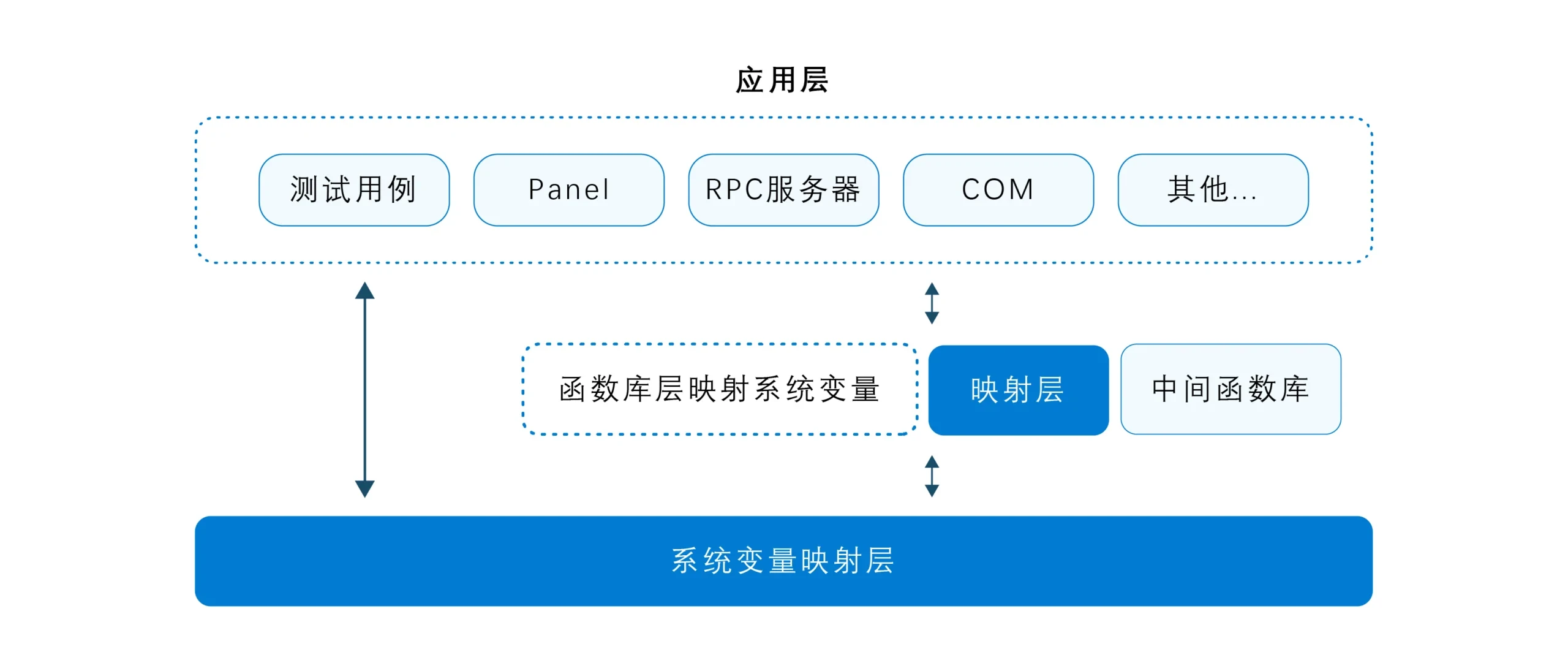 - 内部资源高可访问性,扩展性。通过映射层,把所有的硬件设备,软件资源等映射为系统变量。基于系统变量,内部测试系统,Panel等模块可访问内部资源,本机(非本机)外部进程也能通过RPC和COM访问内部资源。
