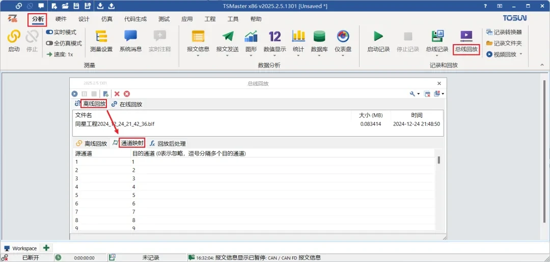 →【分析】-【总线回放】-【离线回放】-【通道映射】