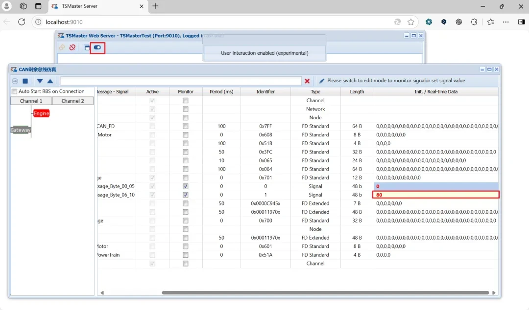 更新功能:用网页访问TSMaster服务器,新增用户交互功能,可以实现将网页端的操作同步到服务器端。如上图:在网页端进行仿真信号设置,在TSMaster服务器端可以查看到修改的报文信息。
