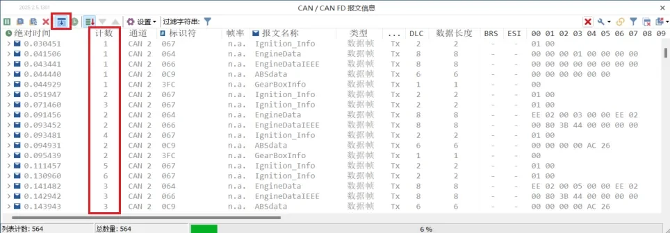 - 以【固定显示】的方式,可以查看到每个报文标识符都独立统计计数并显示。