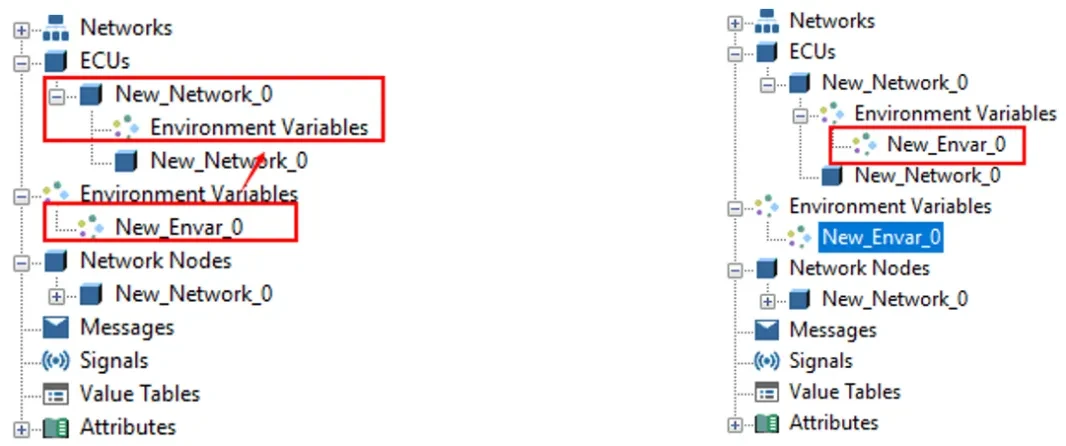 ▲环境变量拖拽到ECU,如下图所示,将环境变量New_Envar_0拖拽到ECUs下的New_Network_0或其下的【Environment Variables】时,会将环境变量New_Envar_0添加到【Environment Variables】下。