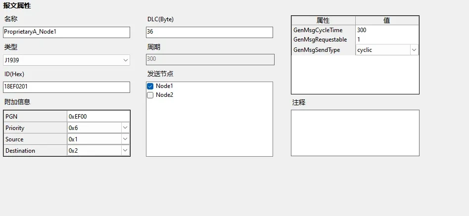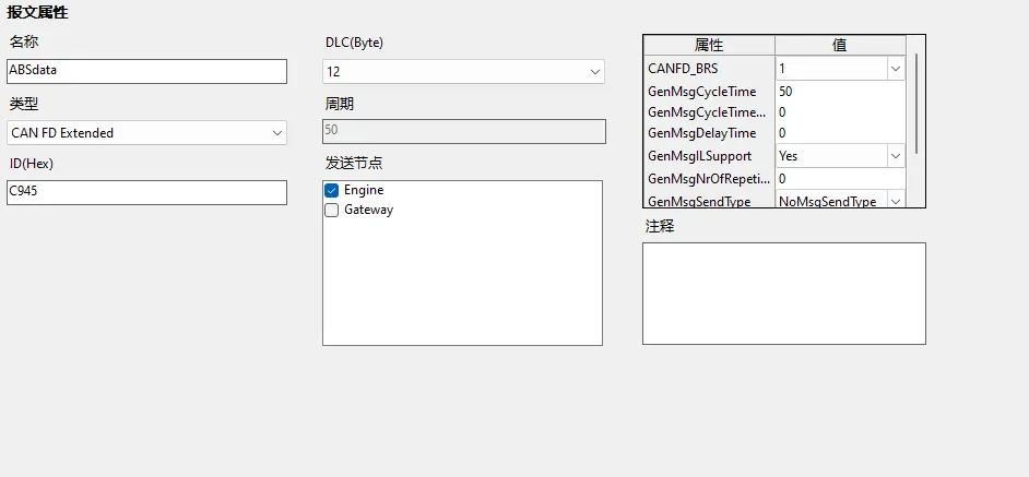 | 周期 | 报文发送周期,通过 GenMsgCycleTime 属性更改,如果没有定义该属性,则无法修改。 |