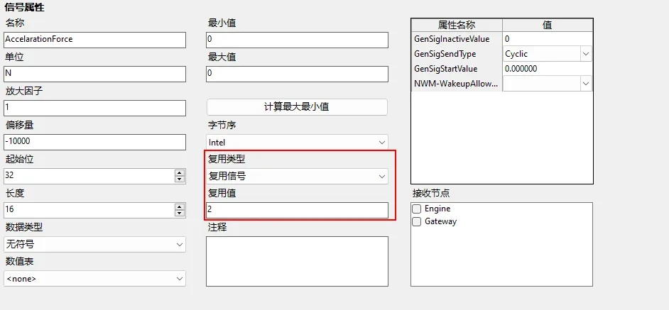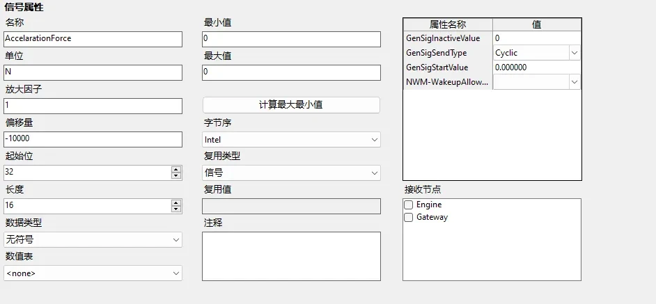 | 接收节点 | 编辑接收该信号的 ECU 节点,选中后会在对应的 ECU 节点的【Mapped Rx signals】下添加当前信号的树节点。如果该信号的报文没有被添加过,还会在【Rx Messages】下添加对应的报文节点。 |