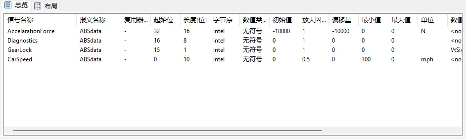 | 名称 | 信号名称,【Signals】/同一个报文下面不允许出现同名的信号。 |