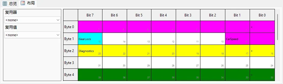 报文布局区可以展示报文中信号在报文中的位置排列和长度,当所选节点为报文时,布局才能被选择,此时布局按钮为激活状态,否则为未激活状态。