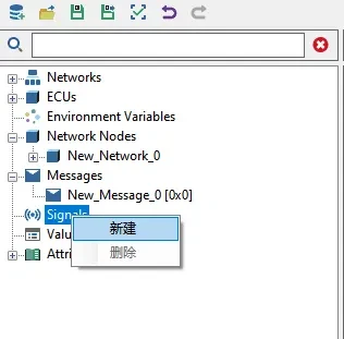 | Signals | 显示所有的信号,如果信号绑定到了报文,则节点名称为 signal_name [Message_name],否则为信号名。当右击【Signals】节点或者该节点下的信号时,可以创建/删除信号。 |