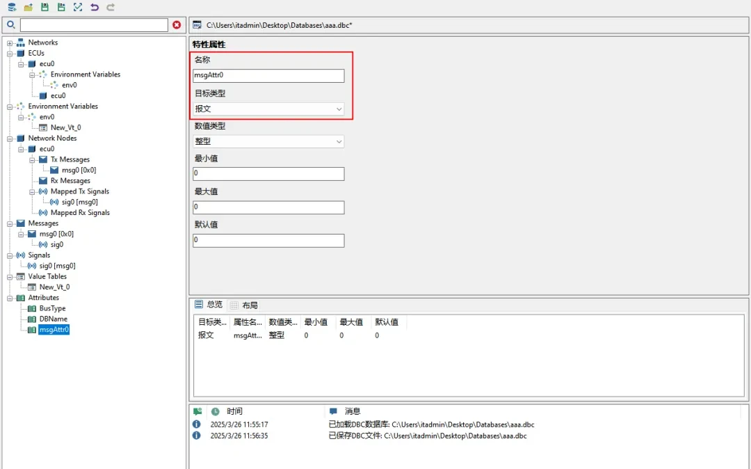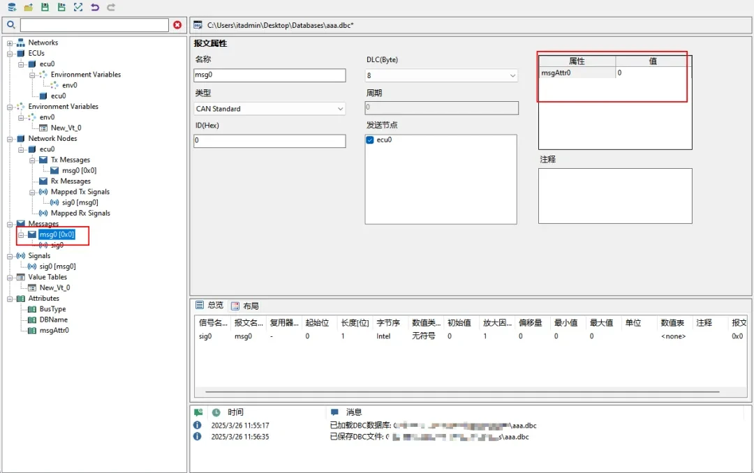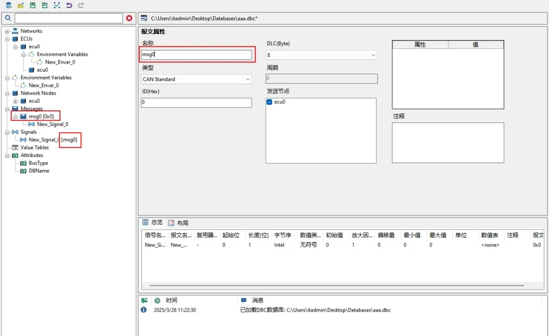 ▲ 修改CAN报文名称。点击【Messages】下的报文节点,在属性编辑区找到【名称】输入框,输入msg0并回车。对于该界面其它的属性字段,也可以类似的方式修改。